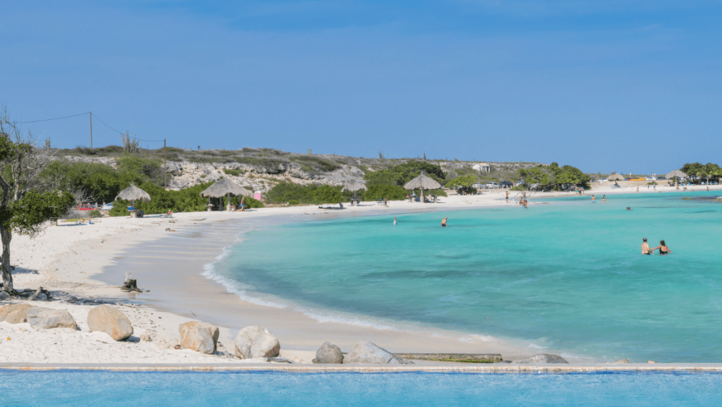 Shade, food, drinks, and washrooms are all nearby. This makes Palm Beach especially appealing if you want a comfortable, full-service beach day. It’s busier than Eagle Beach, but extremely popular for a reason.